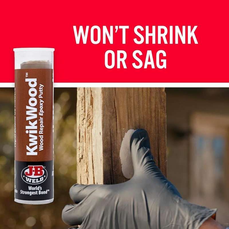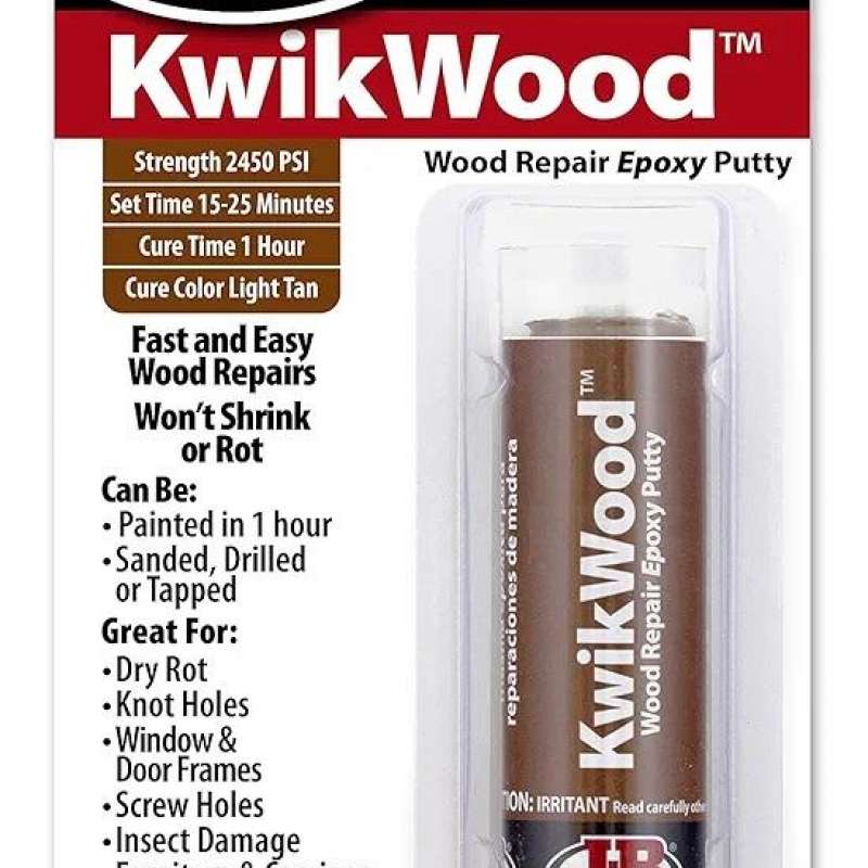 J-B Weld KwikWood is a hand-mixable epoxy putty, formulated to repair and rebuild wood. After mixing, it cures to the same density as wood and becomes an integral part of the repair. For use on exterior or interior applications, it contains no solvents, will not rot, shrink, crack or pull away. KwikWood has a 15-25 minute work life. After 60 minutes, it can be machined, drilled, tapped, sanded, filed and painted. Stronger than wood, KwikWood dries to a light tan color.