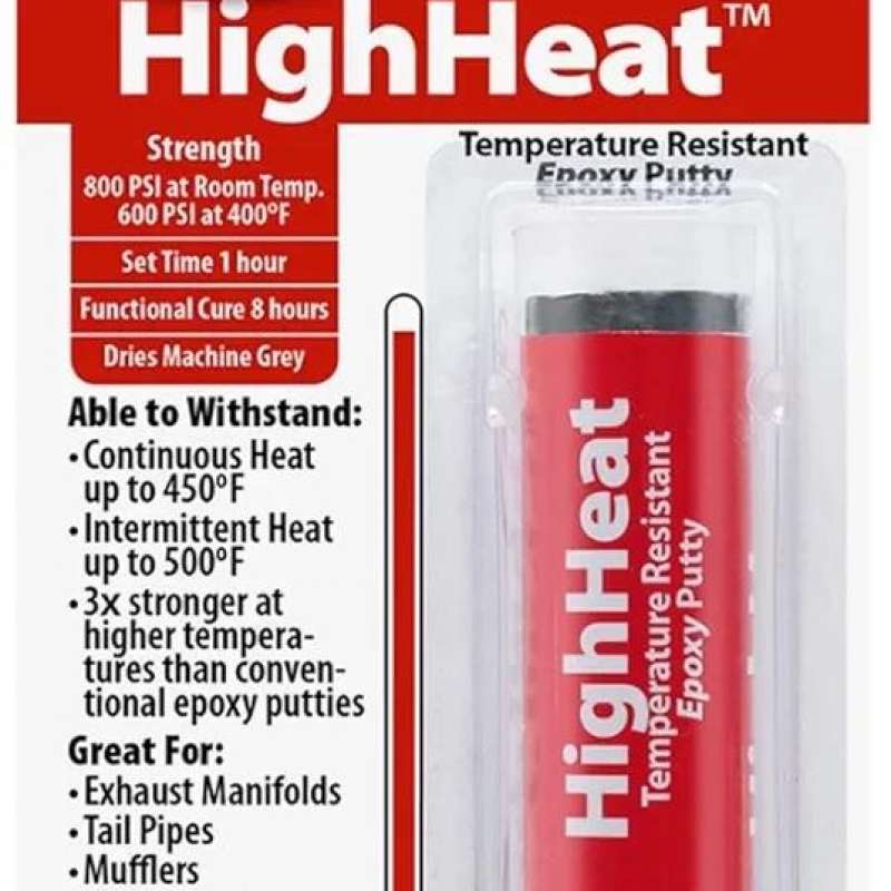 • J-B Weld HighHeat is a hand mixable epoxy putty stick specifically formulated to bond and repair materials that will be exposed to high temperatures in automotive and industrial maintenance applications. It cures to a tough, hard bond with little to no shrinkage. This industrial-strength product outperforms conventional epoxy putties at high temperatures and sets in 1 hour at room temperature. After 8 hours, it can be drilled, tapped, machined, ground, filed and painted. HighHeat is rated at a strength of 4000 PSI and cures to a machine gray in color. It can withstand continuous heat exposure of 500°F and intermittent heat exposure to 550°F.