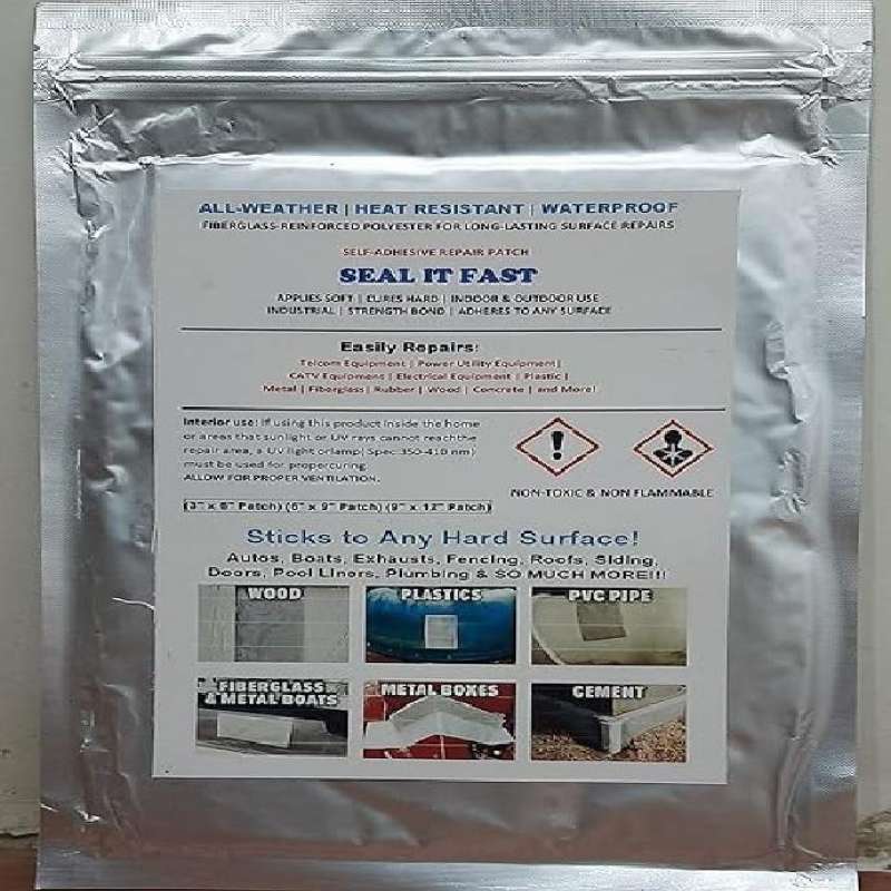 - Seal-It-Fast is a very easy-touse UV- or sunlight-activated repair patch. It is iberglassreinforced polyester and creates long-lasting repairs. Perfect for making watertight, durable repairs on ield equipment, engine parts, decking, fenders, gas cans, drain pipes, water tanks, PVC pipes, plastics, plexiglass, iberglass, metal, wood, concrete, and more. Seal-It-Fast is easy to use and requires no gloves or mixing! Simply clean and dry the target surface and rough up the area to be patched. Cut the patch to the adequate size, remove the film backing and press firmly onto the surface. The curing process takes about 5 to 8 minutes under sunlight or 15 under a UV source. Note: an artificial UV light source is required for indoor use. Extremely durable fiberglass re-enforced polyester/plastic. Flexible and waterproof Weather and UV resistant Can be drilled, tapped, sanded and painted in less than an hour Resistant against many chemicals, solvents and oils Temperature resistant from -40°C to -200°C No shrinkage or expansion during the application or aftercuring Bonds to all surfaces except Polypropylene (PP) Fast curing (starting with 5 minutes,depending on UV intensity.