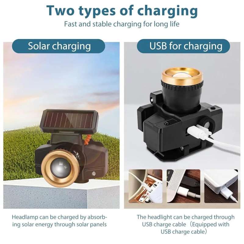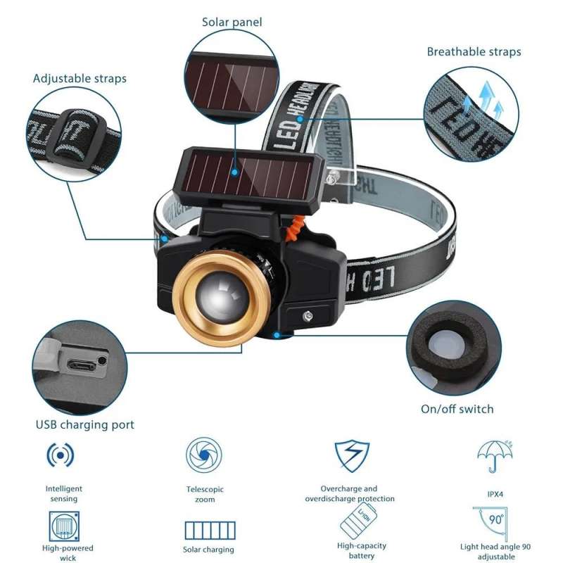This portable solar rechargeable LED headlamp offers versatile lighting with three modes and a sensor switch for hands-free control. Its zoom function allows precise beam adjustment, while the soft headband ensures comfortable wear, compatible with safety helmets or directly on the head. Waterproof design guarantees reliable performance in various conditions, making it ideal for outdoor activities, work, and emergencies. Efficient solar charging provides eco-friendly power, reducing the need for batteries and ensuring readiness whenever you need it.