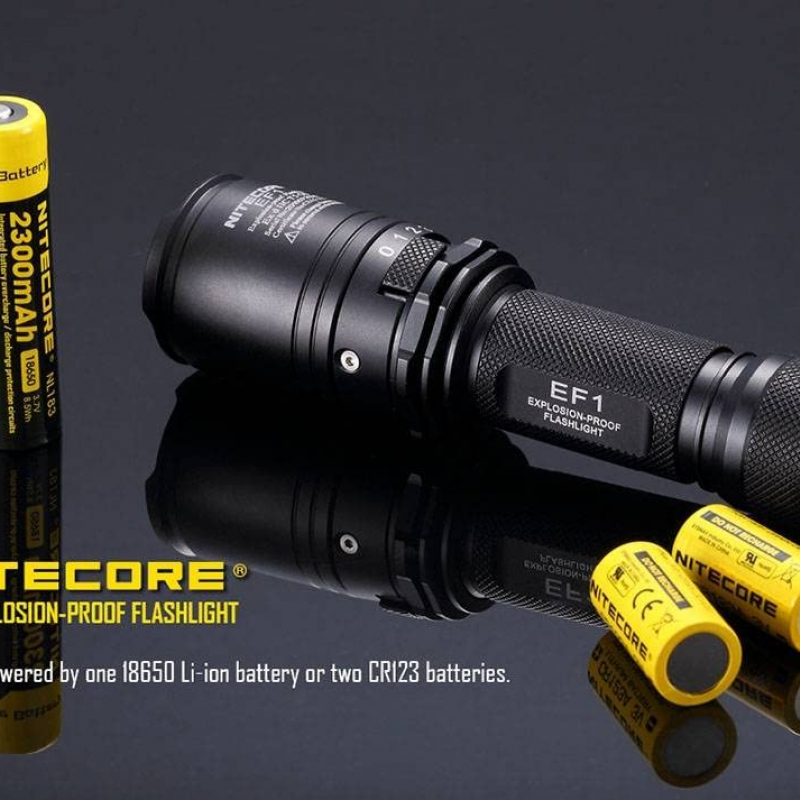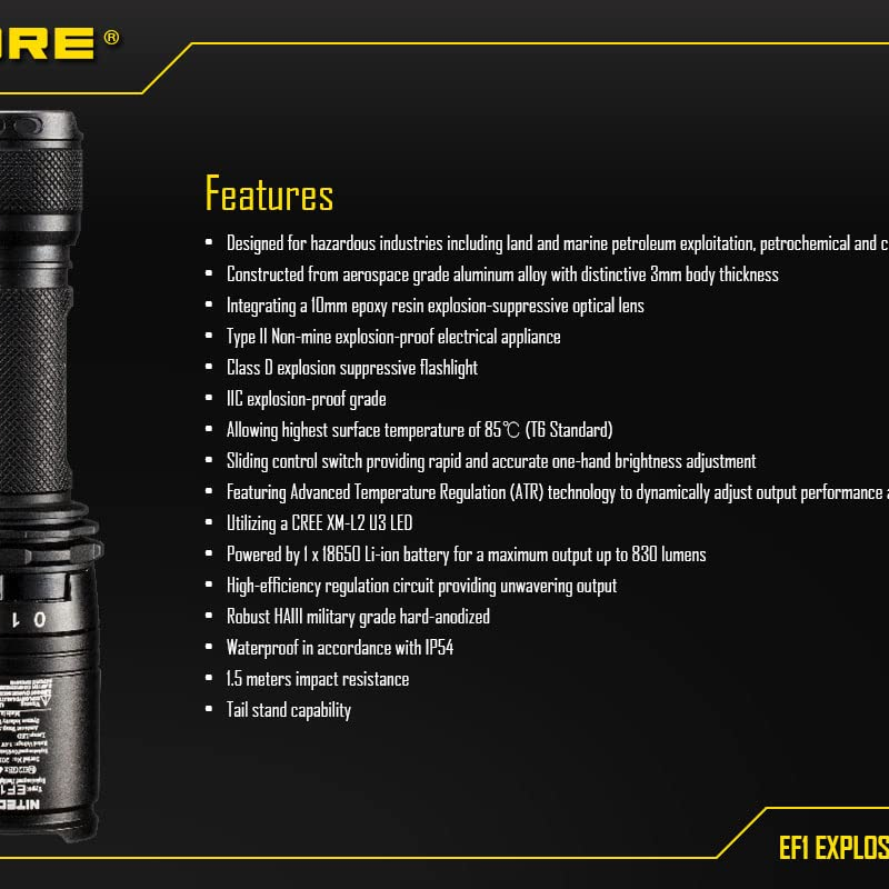 The EF1 from Nitecore is a brand-new flashlight that contains state-of-the-art "explosion-proof" technology that sets it apart from other industrial-strength flashlights. It can function as both an everyday carry (EDC) light and a searchlight, so versatility is one of its key strengths. It's also a great choice to put among your emergency supplies. This is a powerfully bright flashlight, with a max output of 830 lumens and a 18300cd candela rate/peak beam intensity, with a long-lasting run time of 1h 45min. The EF1 has the advantage of being compatible with CR123 batteries as well as a single 18650 cell. The EF1 casts a wide-ranging beam, with a maximum beam distance of 270 meters, due to its smooth (SMO) reflector with Nitecore's own "precision digital optics technology". Its LED is a top-of-the-line CREE XM-L2 U3. Features: Designed for hazardous industries, including land and marine petroleum exploitation, petrochemical and chemical industries Constructed from aerospace-grade aluminum alloy with distinctive 3mm body thickness Integrating a 10mm epoxy resin explosion-suppressive optical lens Type II non-mine explosion-proof electrical appliance Class 2/Div. 2 explosion-suppressive flashlight IIC explosion-proof grade Sliding control switch provides rapid and accurate one-handed brightness adjustment Featuring Advanced Temperature Regulation (ATR) technology to dynamically adjust output performance according to body temperature Utilizing a CREE XM-L2 U3 LED Powered by 1 x 18650 Li-ion battery for a maximum output up to 830 lumens High-efficiency regulation circuit provides unwavering output Robust HAIII military-grade hard-anodized Waterproof in accordance with IP67 1.5m impact resistance Tail stand capability