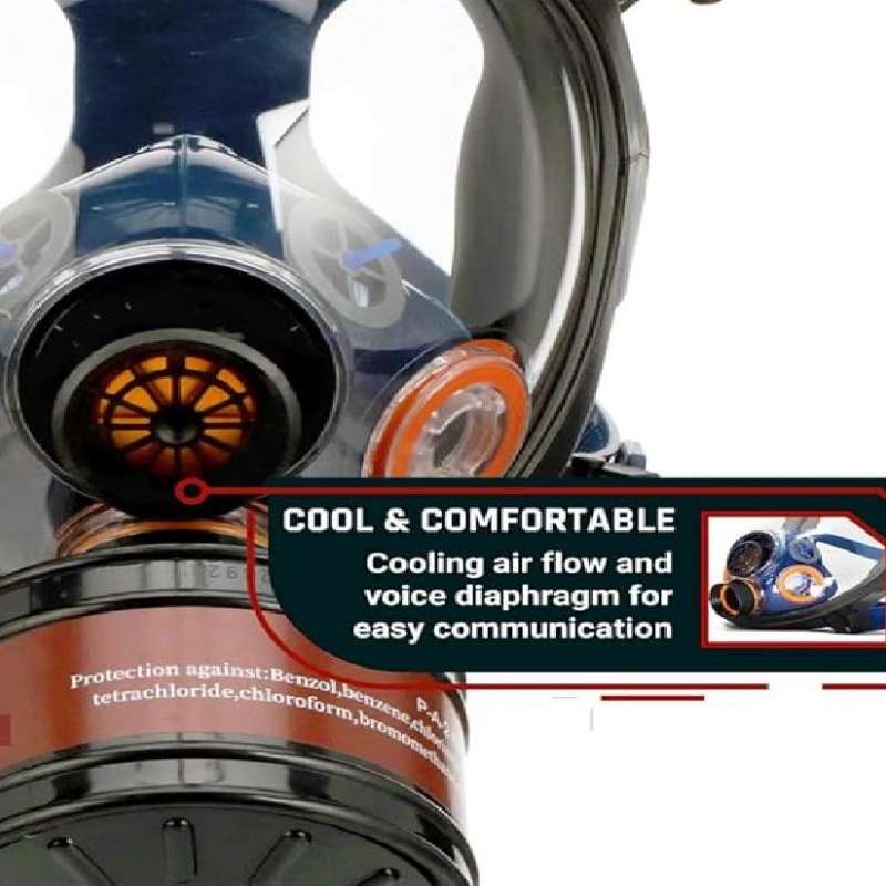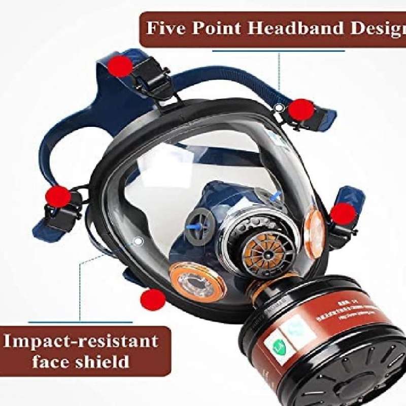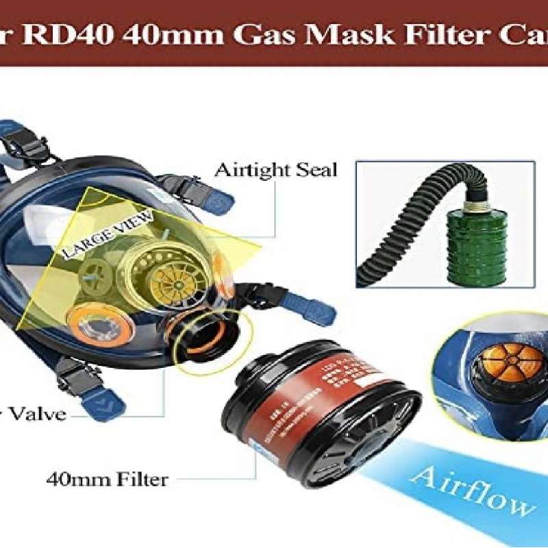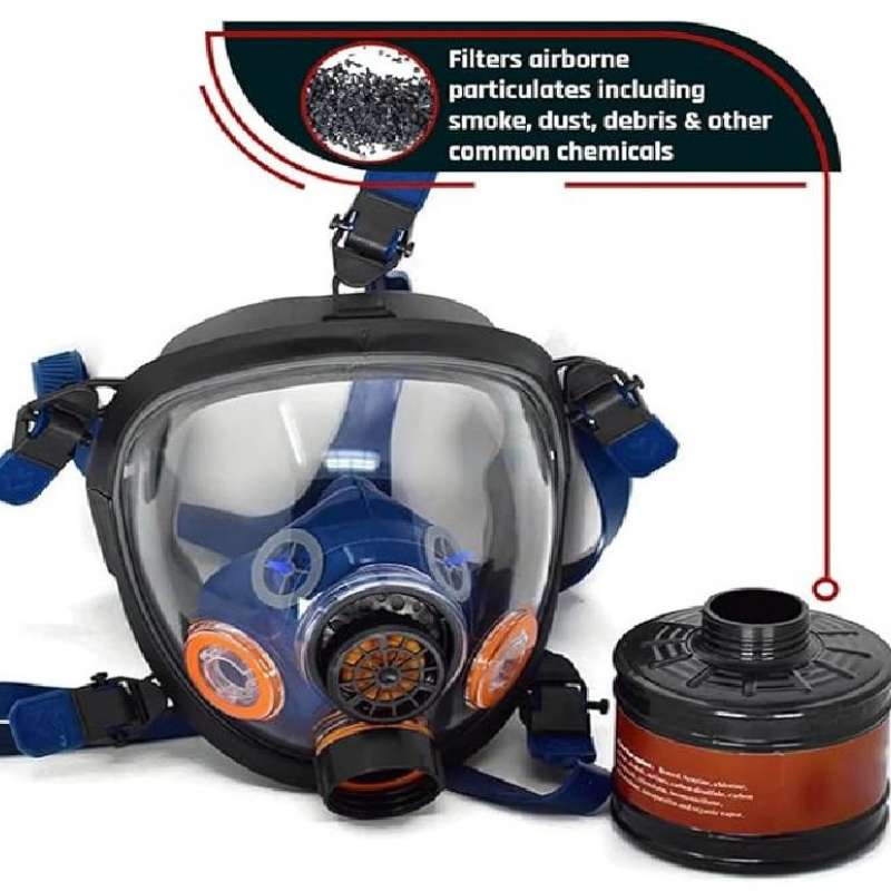 - The Full Face Respirator Gas Mask is the ideal choice for compact, lightweight storage and heavy-duty protection against environmental hazards. Designed to withstand brute force impacts and toxic environments, the Gas Mask and 40mm filter set will provide you the safety and protection you need to navigate unpredictable, dangerous conditions. The sturdy construction starts with its heavy-duty face shield, made from strong silicate glass. For all full-face respirators, we utilizes dual-convex face shield designs vs. flat designs for enhanced user field of view and comfort. This design also enables a wider field of view, augmenting the user's visibility and spatial awareness which are crucial during perilous situations. The Gas Mask's superior breathability originates from the dual intake valves which support increased cardiovascular effort instead of inhibiting breathing. The intelligent ventilation structure creates cooling airflow, helping the user stay collected and focused during high-intensity situations. The Gas Mask’s cartridge interface is threaded for industry-standard 40mm cartridges. This set includes the 40mm carbon-activated filter which is housed in heavy-duty plastic for long-term durability. The filter is independently tested to protect against respiratory hazards like non-oil-based particulates and organic vapors. The 5 point harness was manufactured for both comfort and convenience. Designed for a universal fit, the harness stretches cleanly over the head without snagging or pulling and secures quickly and properly through the 5 pull tabs. The straps are made from dense, sturdy elasticized rubber and retain their shape even in the hottest environments. The face seal is fashioned from natural rubber, which feels soft to touch but maintains a strong, airtight fit around the face. Created for long-term use and to withstand harsh environments, it will not wear, lose its shape, or retain odor.