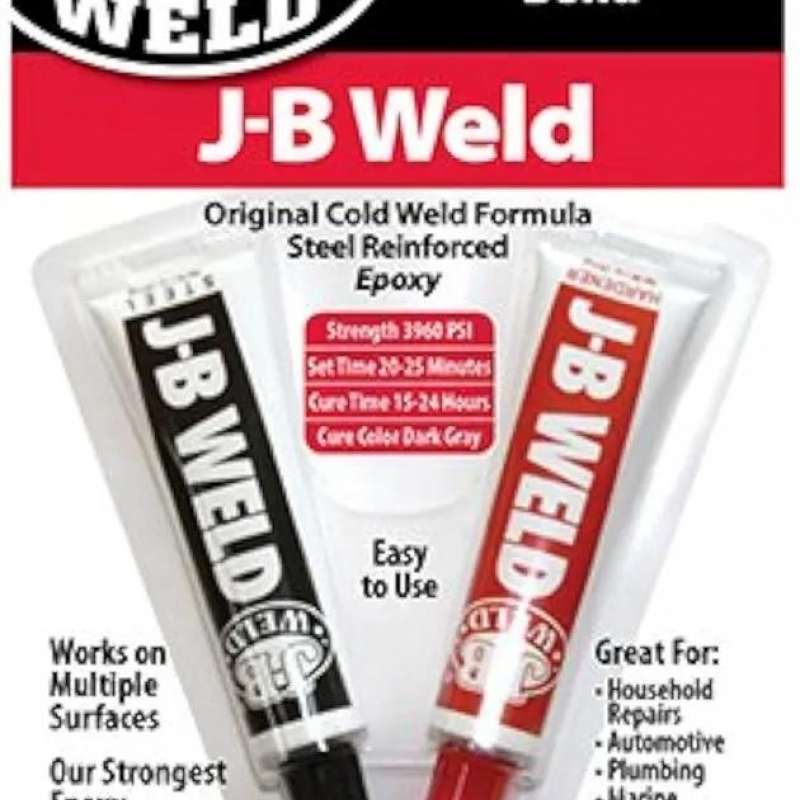 J-B Weld is The Original Cold Weld two-part epoxy system that provides strong, lasting repairs to metal and multiple surfaces. Mixed at a ratio of 1:1, it forms a permanent bond and can be shaped, tapped, filed, sanded and drilled after curing. At room temperature, J-B Weld sets in 4-6 hours to a dark grey color. A full cure is reached in 15-24 hours. J-B Weld has a tensile strength of 5020 PSI and sets to a hard bond overnight. It can withstand temperatures up to 550°F when fully cured.